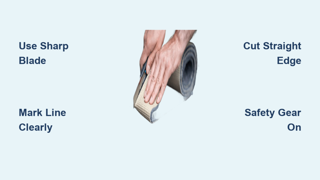 Position your carpet backing-side up on a completely flat surface. Mark your cutting line clearly using chalk or washable markers on the backing side. Place a metal straight edge along the marked line, holding it firmly with your non-dominant hand. Position the cutter blade against the straight edge at a 45-degree angle. Apply consistent pressure while pulling the cutter toward you in one smooth motion. Make multiple light passes rather than forcing one deep cut—this creates cleaner edges and reduces blade wandering. Check your cut edge against a light source to spot imperfections before installation.