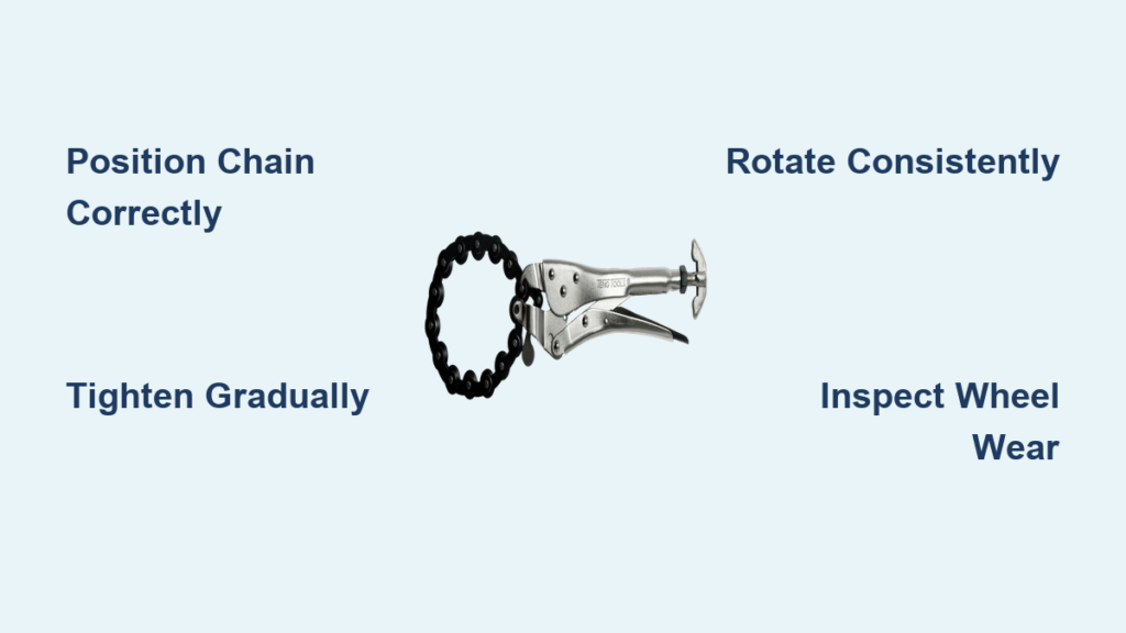 Chain placement determines everything. Wrap the chain around your pipe with cutting wheels sitting directly on your mark. All wheels must contact the surface—if even one floats above, you’ll get an angled cut. Start tightening clockwise until wheels just kiss the metal. This initial contact point is critical: too loose and wheels slip; too tight and you crush the pipe.