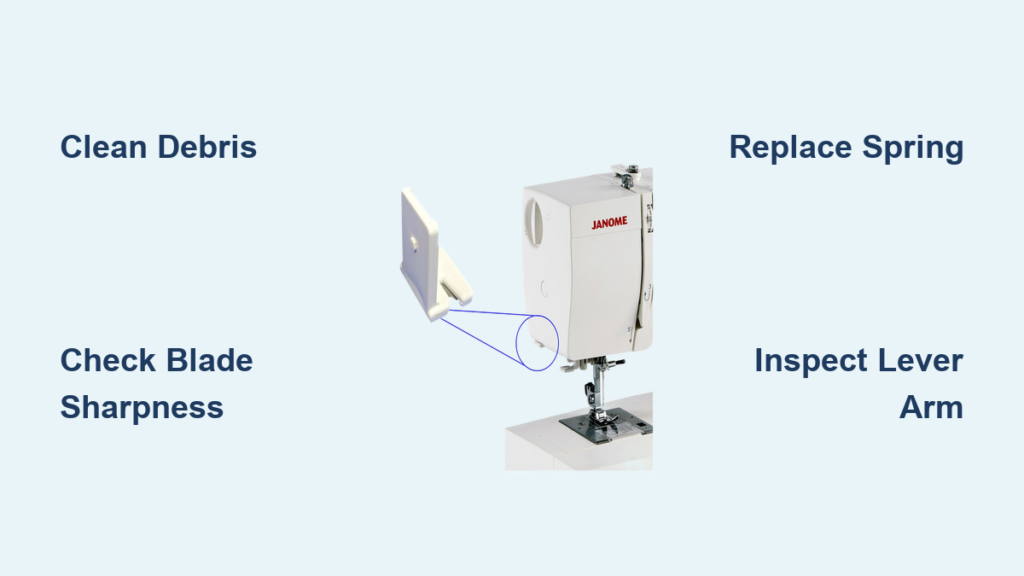 Weak return springs cause blades that won’t reset properly after cutting. Replace springs showing visible deformation or those stretched beyond their original length. Spring replacement requires basic tools and takes approximately 15 minutes on most Janome models. Ensure you install the correct spring tension—too weak won’t return the blade, while too strong can damage other components.